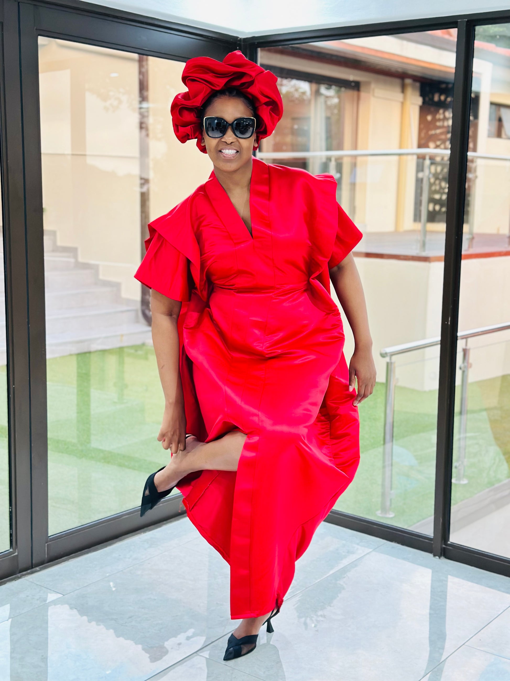 Bubu dress with matching head band. has belts on the side for that snatched waist look.